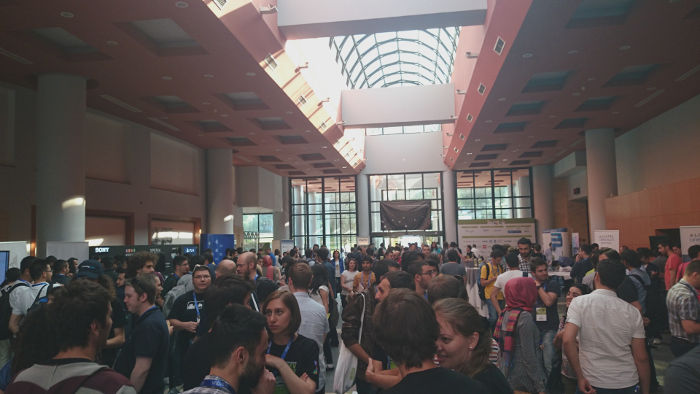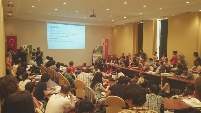 Katıldığım bir başka oturum. Fotoğraftaki bu kadar insan Eteration'dan tanıdığımız Ecem Dalgıç'ın Sphero olarak anılan portakal büyüklüğündeki robotla ilgili sunumunu dinliyor. Kapı ağzında izleyebildiğim sunumlardan biri :).