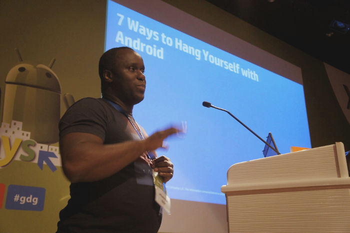 Arnaud Bah, uzun zamandır HP'nin güvenliğe yoğunlaşan biriminde danışmanlık yapıyormuş. "Android ile İntihar Etmenin 7 Yolu" ismini verdiği sunumunda Android ile uygulama geliştirenlerin sıkça içine düştükleri tuzaklardan bahsetti. Aksanı sebebiyle açıkçası Arnaud'u anlamakta zorluk çektim ancak sunumunu gayet iyi oluşturmuş. Dinleyiciler için "Intent hijacking", "Intent spoofing", "Sticky broadcast tampering", "Insecure storage", "Insecure network communicaction", "SQL Injection", "Promiscuous privileges" başlıklarıyla bölümlemişti. Katılanların pür dikkat dinlediği bir konuşmacıydı.
