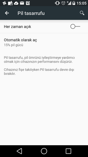 Tüm bu anlattıklarıma ek olarak, Android L öngösterim sürümüne Pil Tasarruf modu gelmiş. Öntanımlı olarak %15'e ayarlanmış durumda ama siz isterseniz bunu tamamen kapatabilir ya da yüzdesine 5, 10, 15 veya 20 değerinden birini verebilirsiniz. Cihaz pil tasarruf moduna geçince cihaz bütün geçiş animasyonlarını kapatıyor. Ayrıca sürekli bir bildirim görünmeye başlıyor.