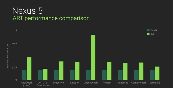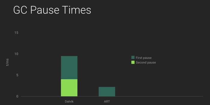 Geleceği Yazanlar'da ART ile alakalı sevgili Can Çiloğlu güzel bir blog yazısı kaleme almıştı, buradan gerekli detaylara ulaşabilirsiniz. O günden bu yana Android L öngösterim sürümünde değişen kısım, artık öntanımlı olarak ART kullanılıyor olması. ART, 64 bit mimariyle de tamamen uyumlu çalışmaya başlamış. Aşağıdaki grafikte ART ile Dalvik arasındaki performans farkını görebilirsiniz.