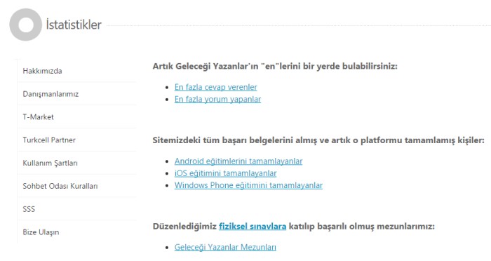 Turkcell Geleceği Yazanlar portalına yeni bir sayfa daha eklendi. Artık, Geleceği Yazanlar üyeleri istatistikler sayfası üzerinden sitede en aktif kullanıcıların listesine ulaşabilecek. "En fazla cevap verenler" ve "En fazla yorum yapanlar" gibi listelerin yer aldığı istatistikler sayfasında, sitedeki başarı belgelerini almış ve artık o platformu tamamlamış olan kişiler de "Android eğitimlerini tamamlayanlar", "iOS eğitimlerini tamamlayanlar" ve "Windows Phone eğitimini tamamlayanlar" olarak farklı kategoriler altında sıralanıyor.